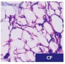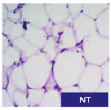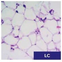 Histology of untreated adipose tissue (NT), Lipo-VET processed (LC), and centrifuged (CF) lipoaspirate centrifugation. The hematoxylin eosin staining shows the maintenance of tissue architecture integrity, see LC example.