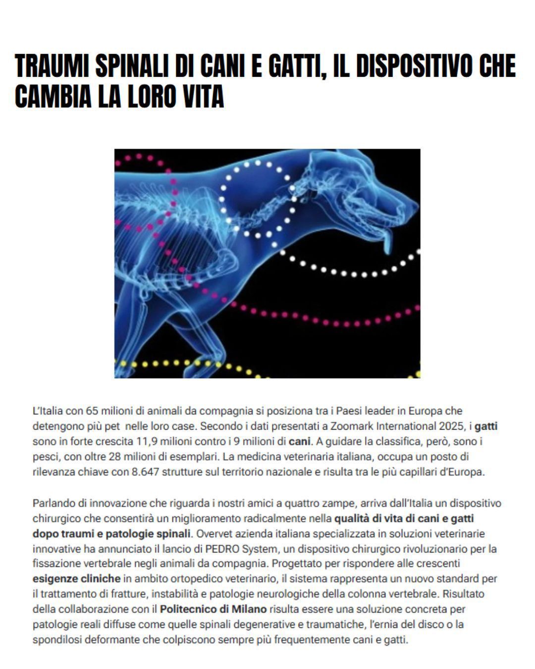 We believe in innovation that makes a real difference in veterinary care: designing solutions that reduce invasiveness, speed up recovery and restore hope to beloved pets and their families. The mention in Libero Quotidiano not only brings our message to a wider audience, but also affirms the value of veterinary advancement in improving animal quality of life.