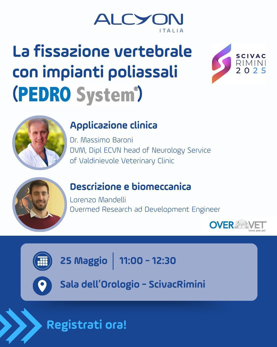 On the occasion of SCIVAC Rimini 2025, the most important national congress dedicated to small animal veterinary medicine, we had the honor of being hosted by Alcyon Italia at the event “Vertebral fixation with polyaxial implants using our PEDRO System®.”